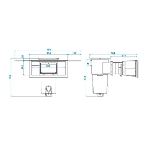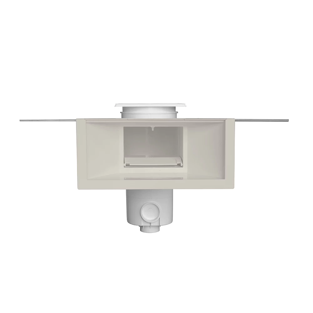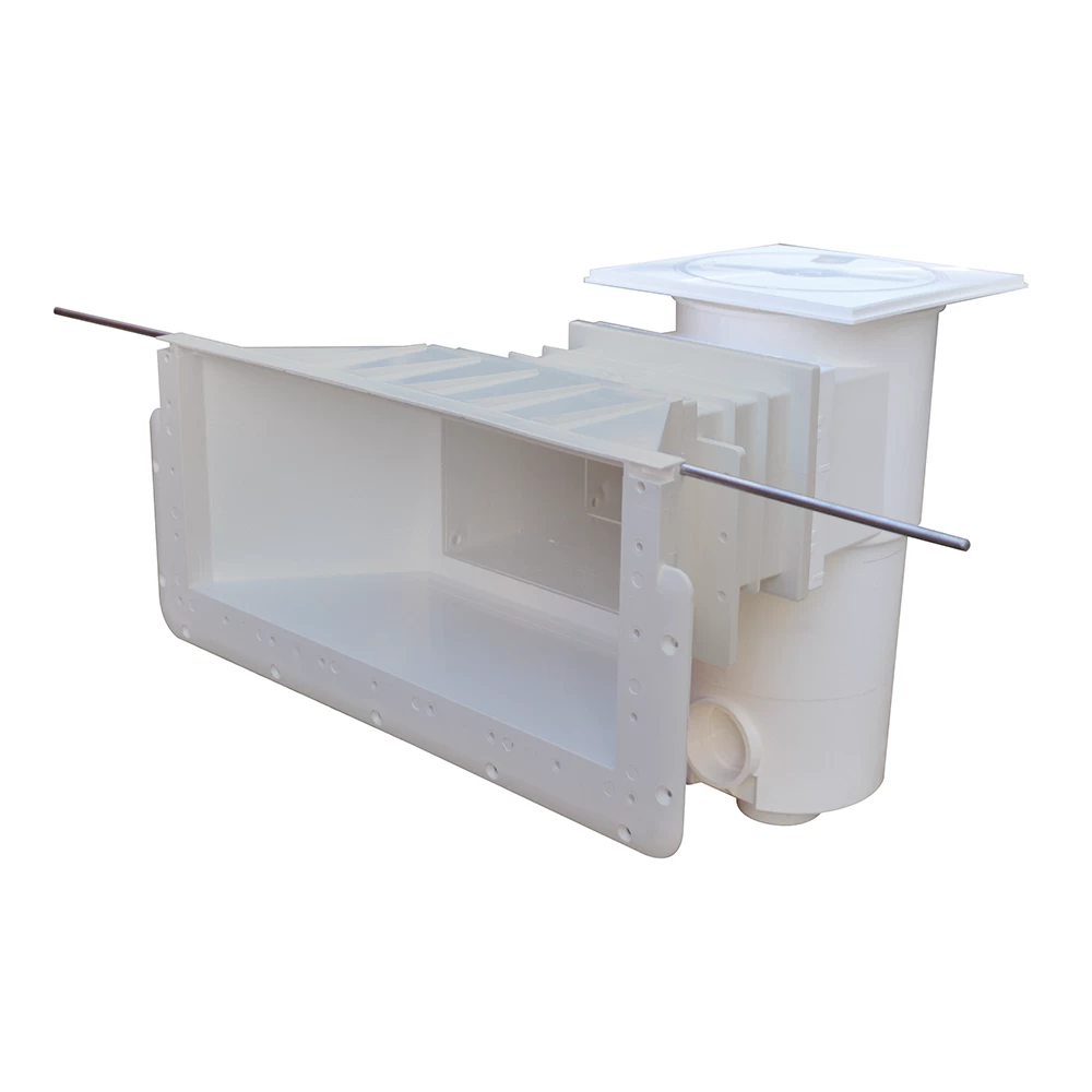 Deze zwembad skimmer wordt met de bovenzijde gelijk van de zwembad wand ingebouwd.