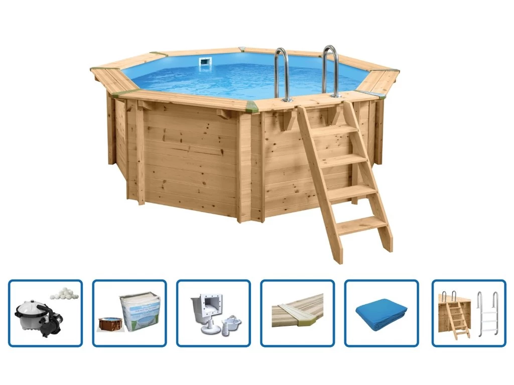 Geniet van jarenlang zorgeloos zwemplezier met dit prachtige houten zwembad.