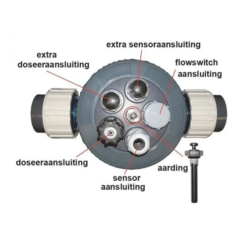 Met plaats voor flowswitch (flowswitch is optioneel), aarding, 2 sensor aansluitingen en 2 doseernippel aansluitingen.