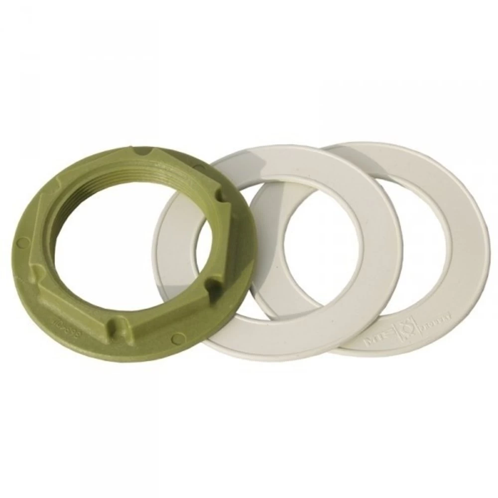 Deze moer met de 2 pakkingen wordt gebruikt voor het vastzetten van een inlaat fitting of inspuiter bij bv prefab zwembaden.
