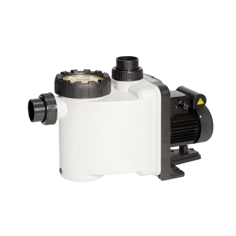 Met zijn witte pomphuis, en zwarte accenten past deze zwembad pomp in de moderne filter installaties.